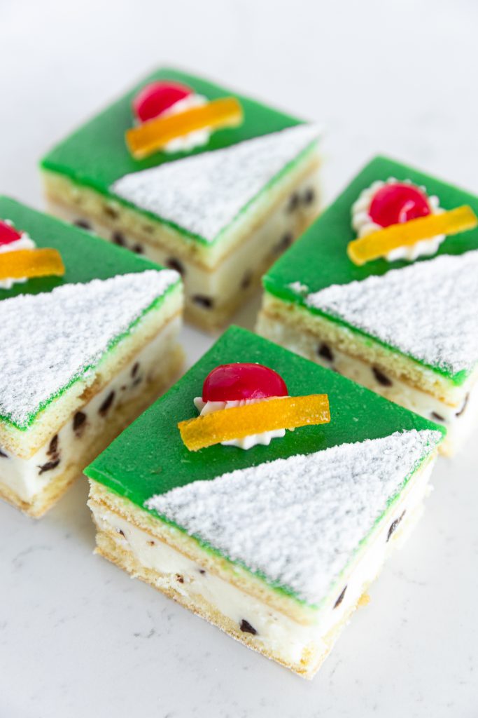 Vanilla sponge + vanilla pastry cream + chantilly cream + toasted almonds + candied cherries